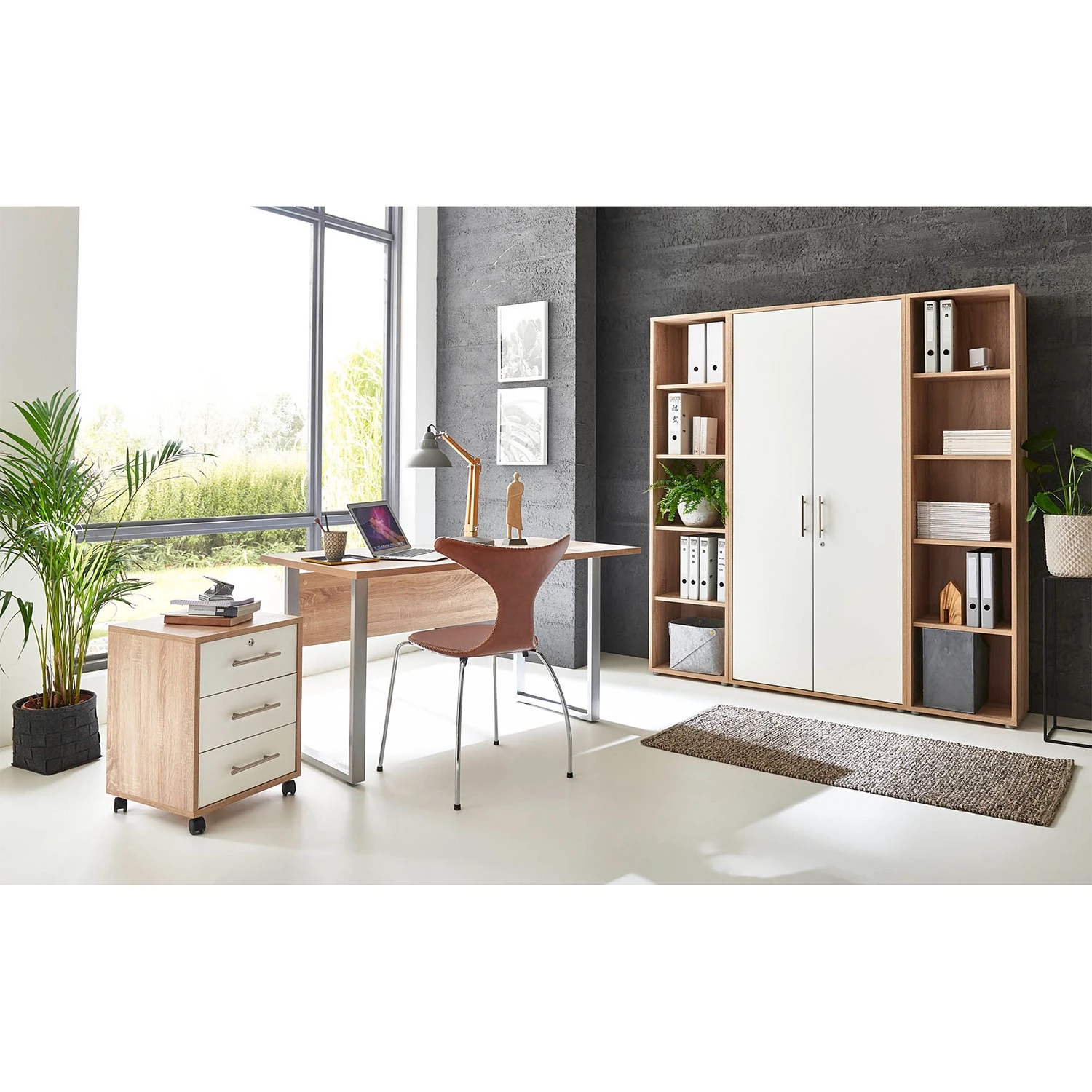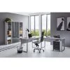 - Contenu de la livraison : Ensemble de bureau de 5 éléments comprenant : 1 bureau d’angle, 1 caisson à roulettes, 2 étagères et 1 armoire de bureau