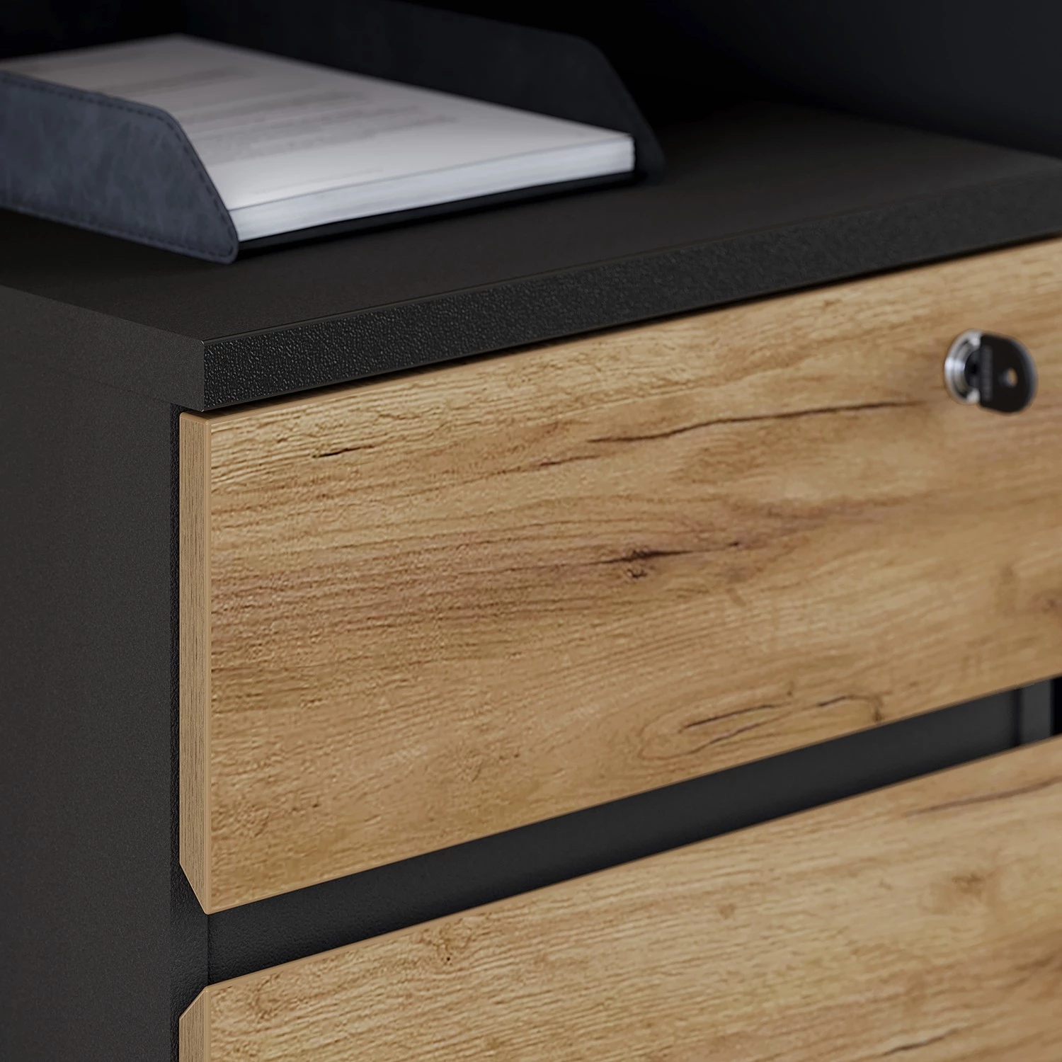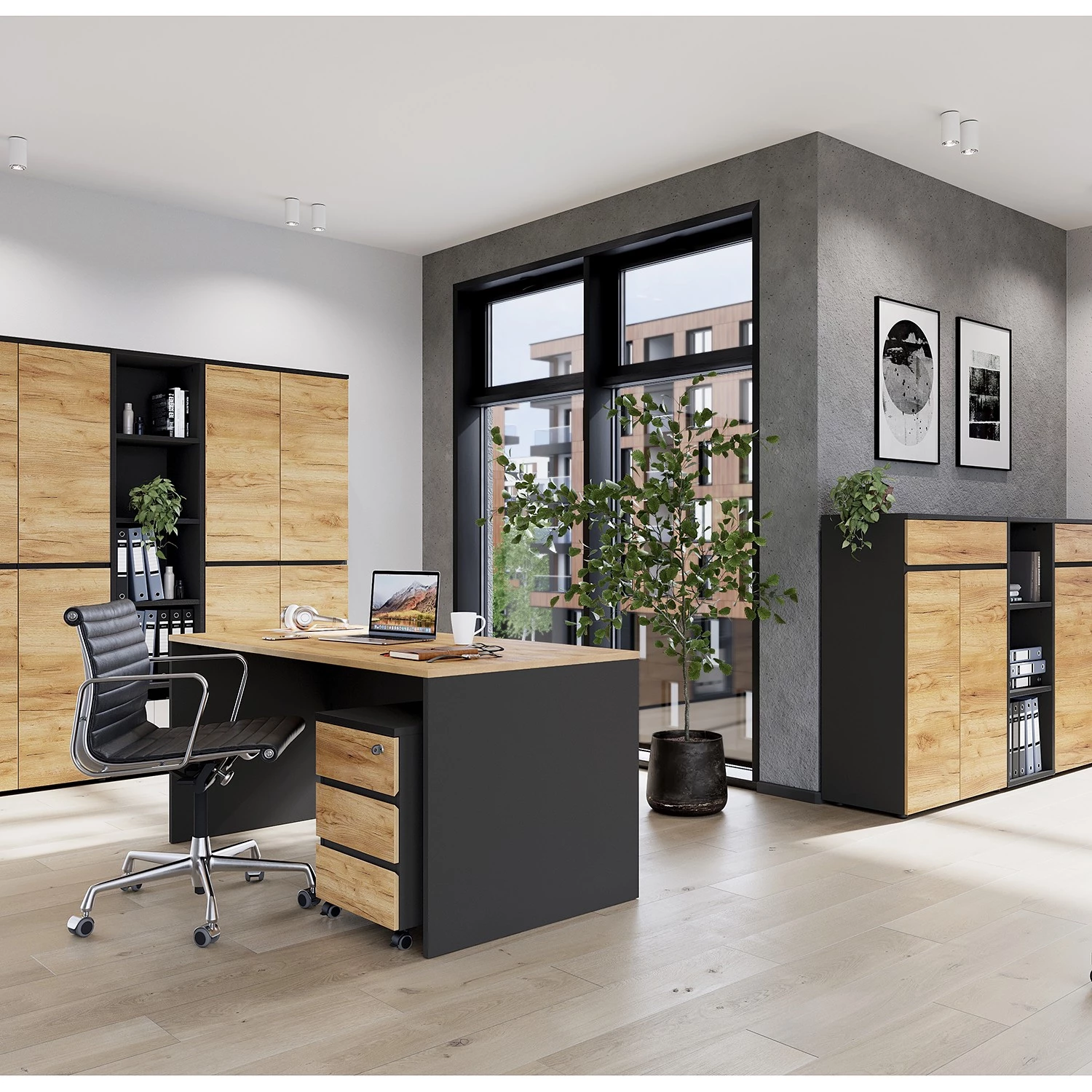 - Contenu de la livraison : Ensemble comprenant 1 bureau, 1 caisson sur roulettes, 2 armoires et 2 étagères de bureau