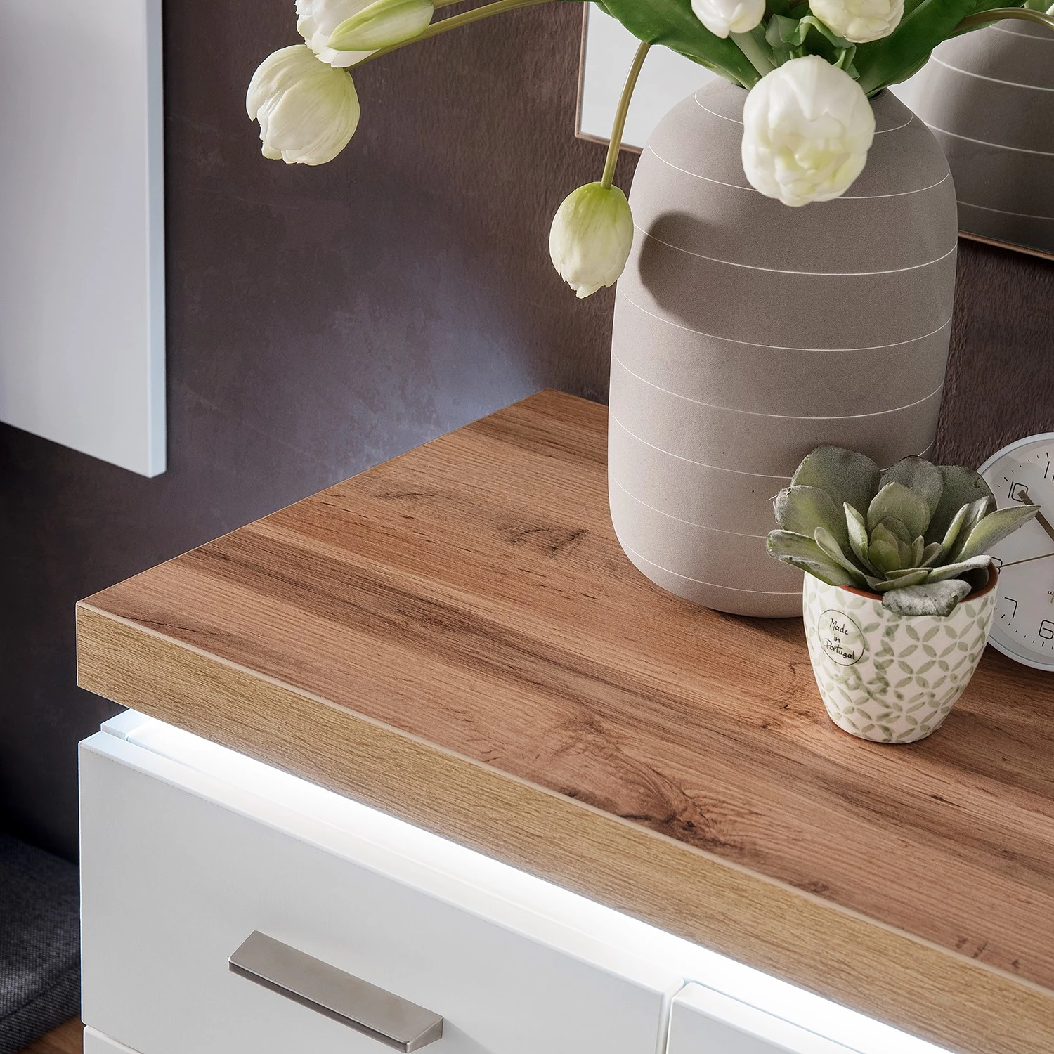 - Contenu de la livraison : 1 armoire d’entrée, 1 porte-manteau mural, 1 banc d’entrée, 1 miroir et 1 meuble à chaussures, avec éclairage, sans coussins ni accessoires