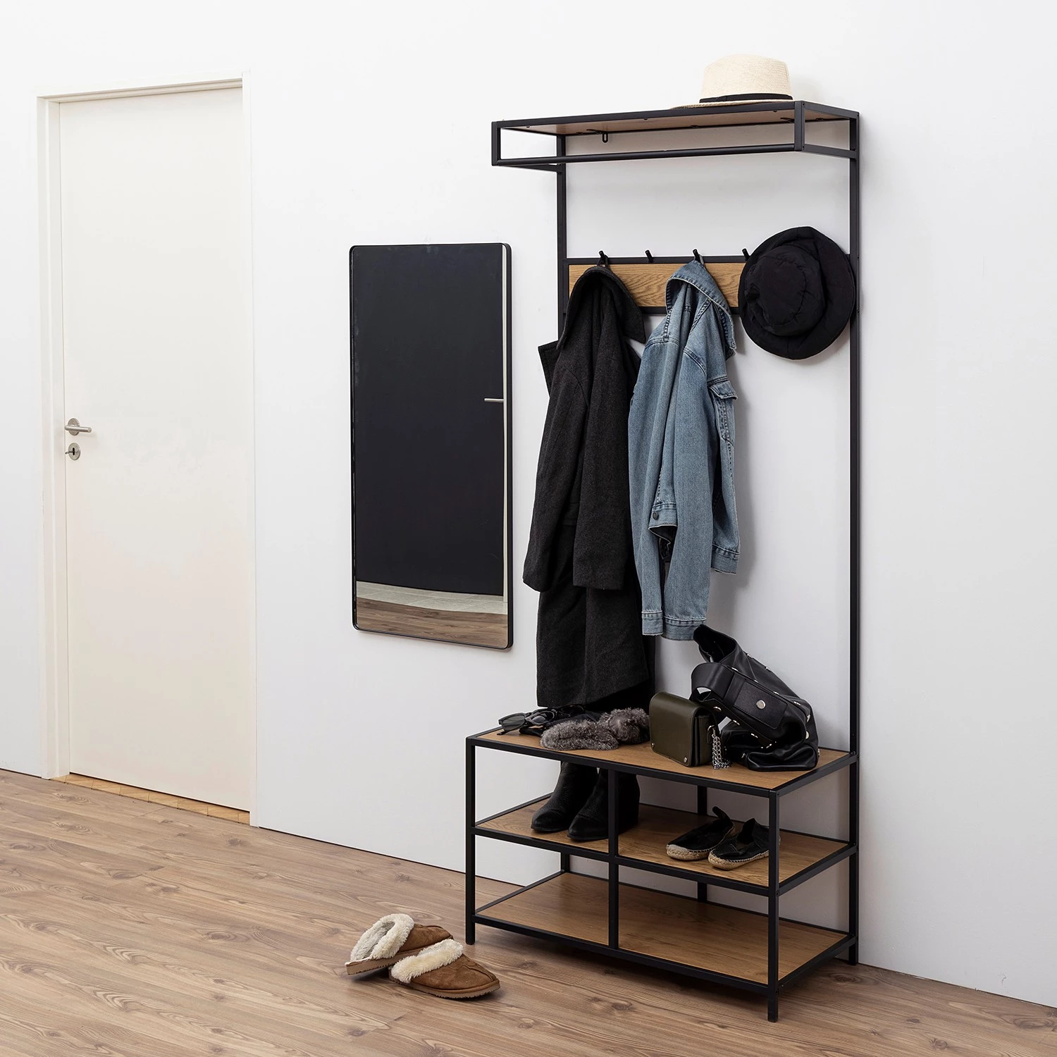 - Porte-manteau et étagère : imitation chêne sauvage
