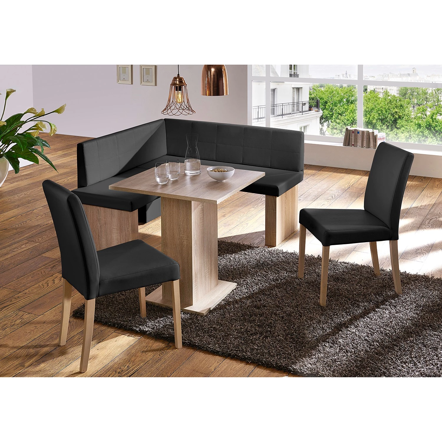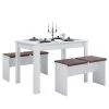 - Contenu de la livraison : Ensemble de salle à manger comprenant 1 table, 1 banc d’angle (non réglable) et 2 chaises